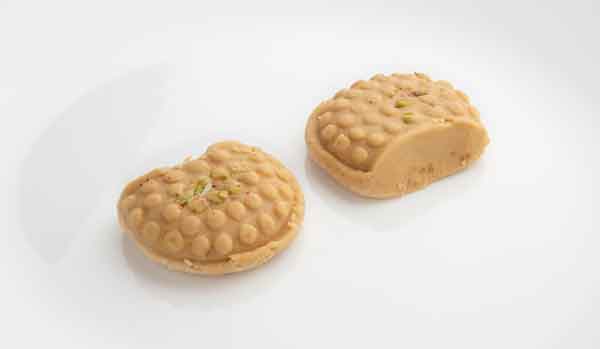 Soft sandesh made of chhana and date palm jaggery with pista garnishing