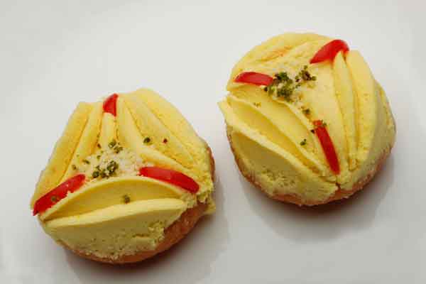 Juicy base with a layer of kesar flavoured chhena (type of cottage cheese) on top with cherry toppings